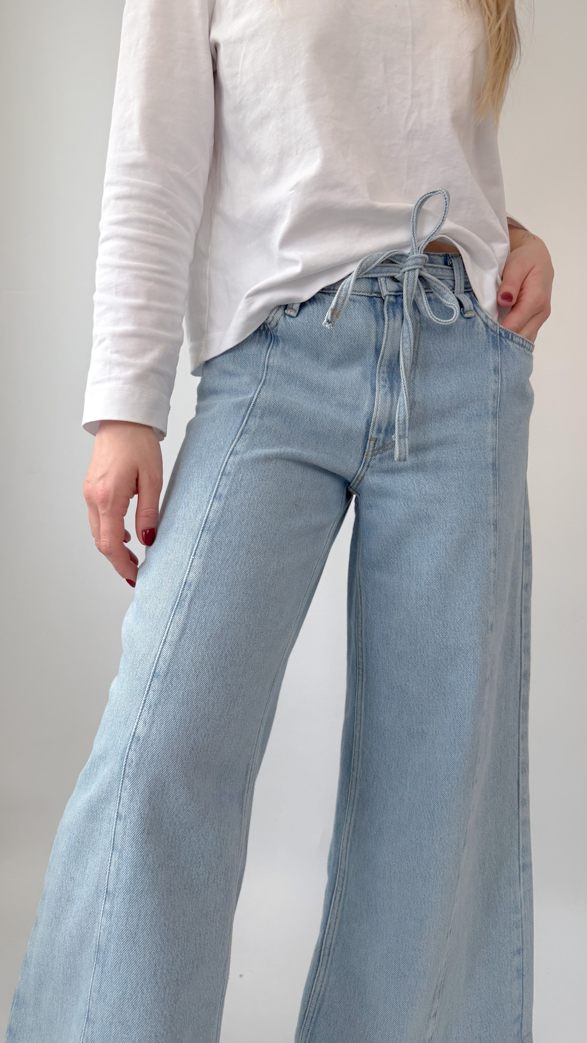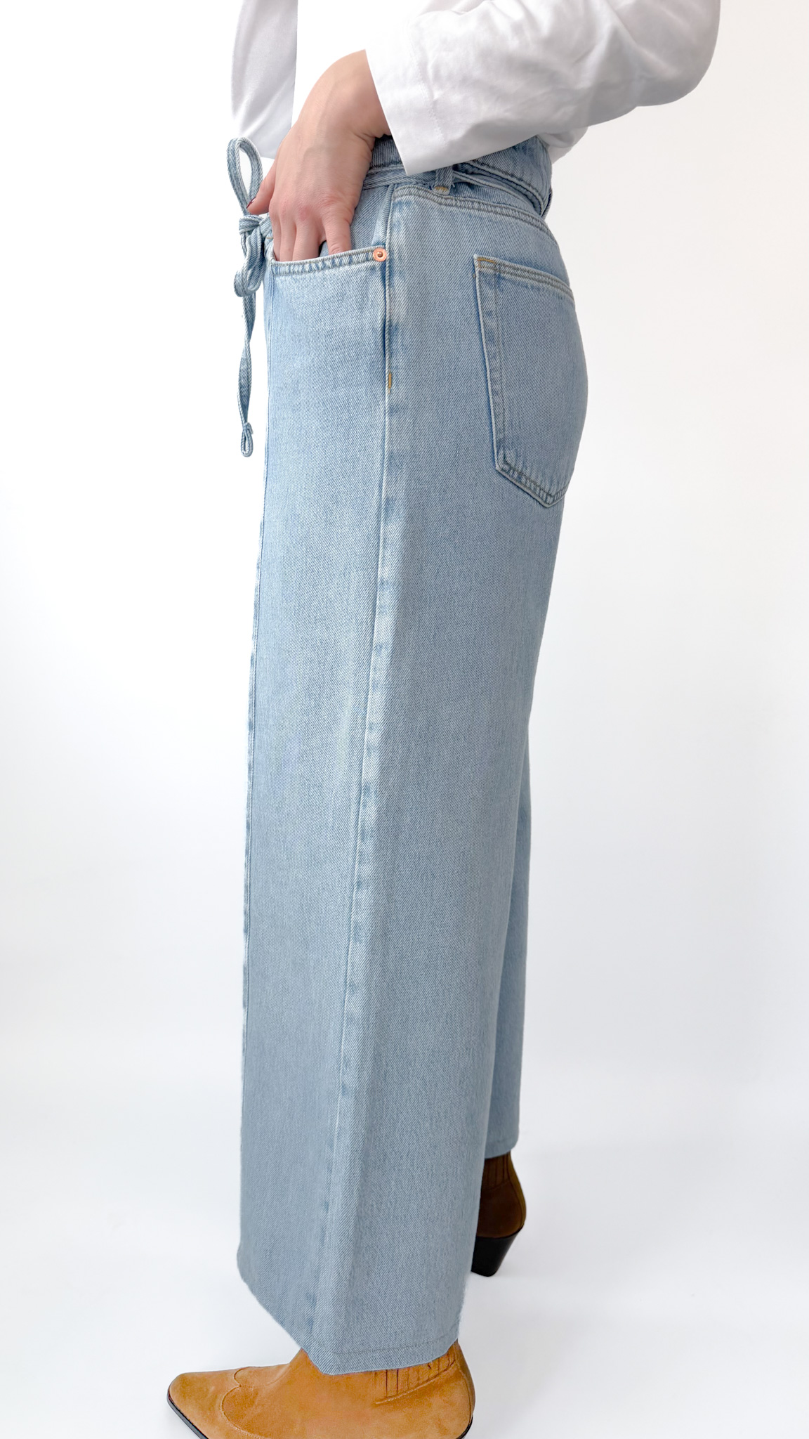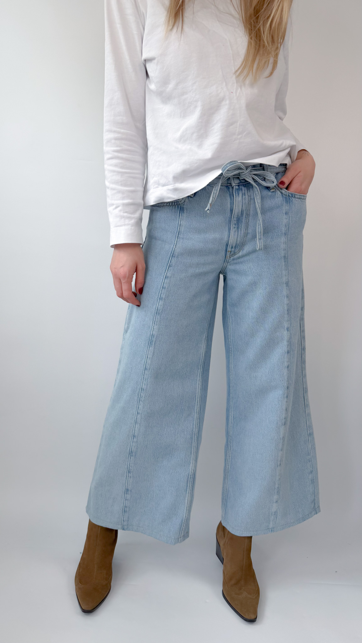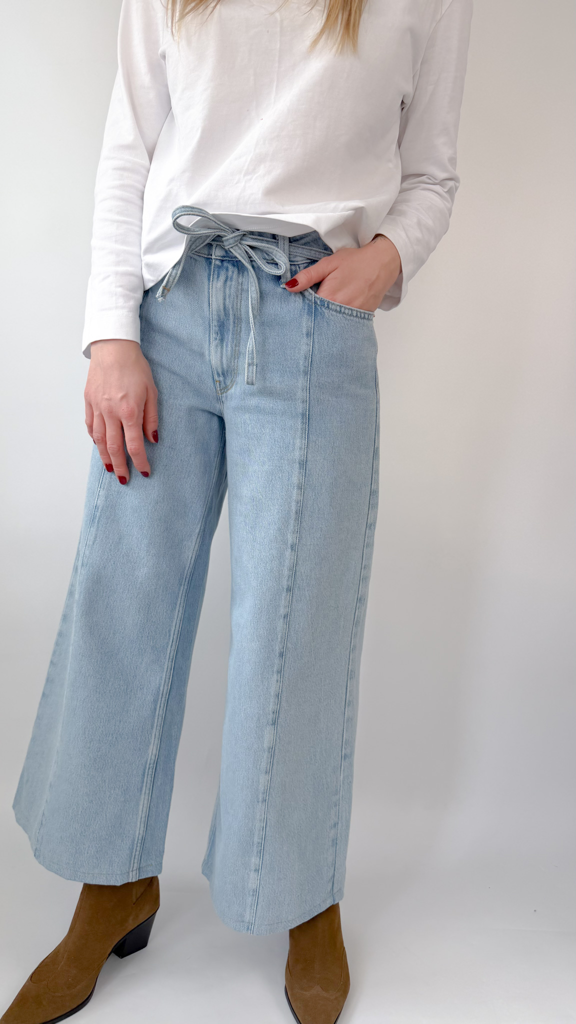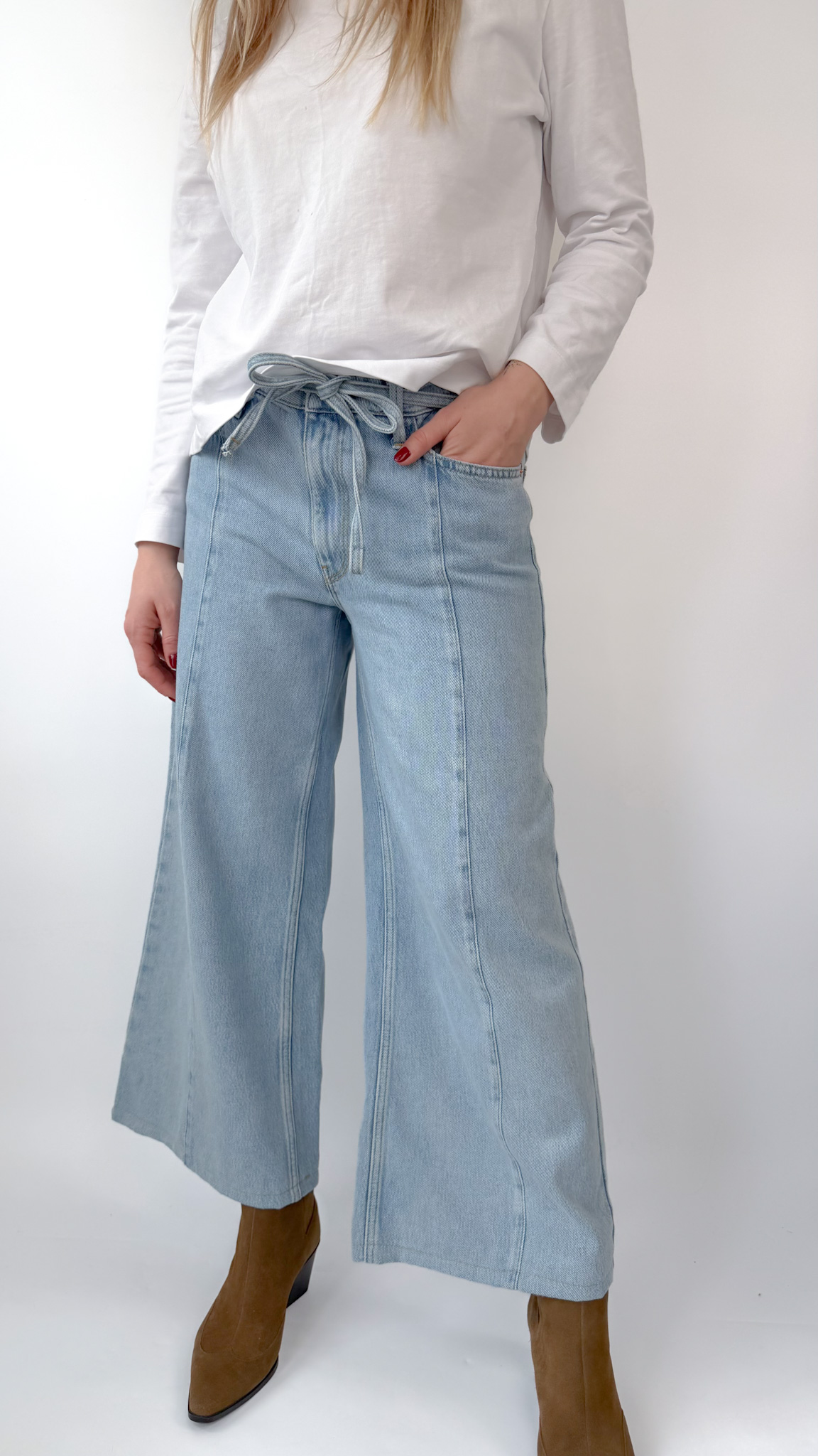 Mięciutkie spodnie wykonane z przyjemnej mieszanki bawełny i lyocellu, idealne dla kogoś kto nie przepada za sztywnym jeansem. Wygodnie wiązane w pasie.