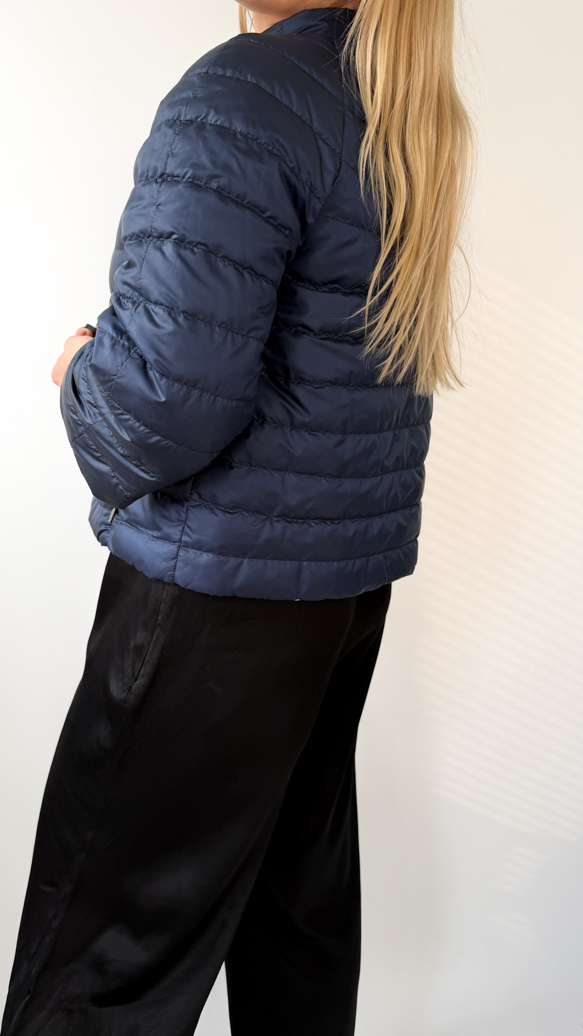 Kurtka puchowa dwustronna z rękawem 3/4, możliwość noszenia na stronie perłowej oraz granatowej.