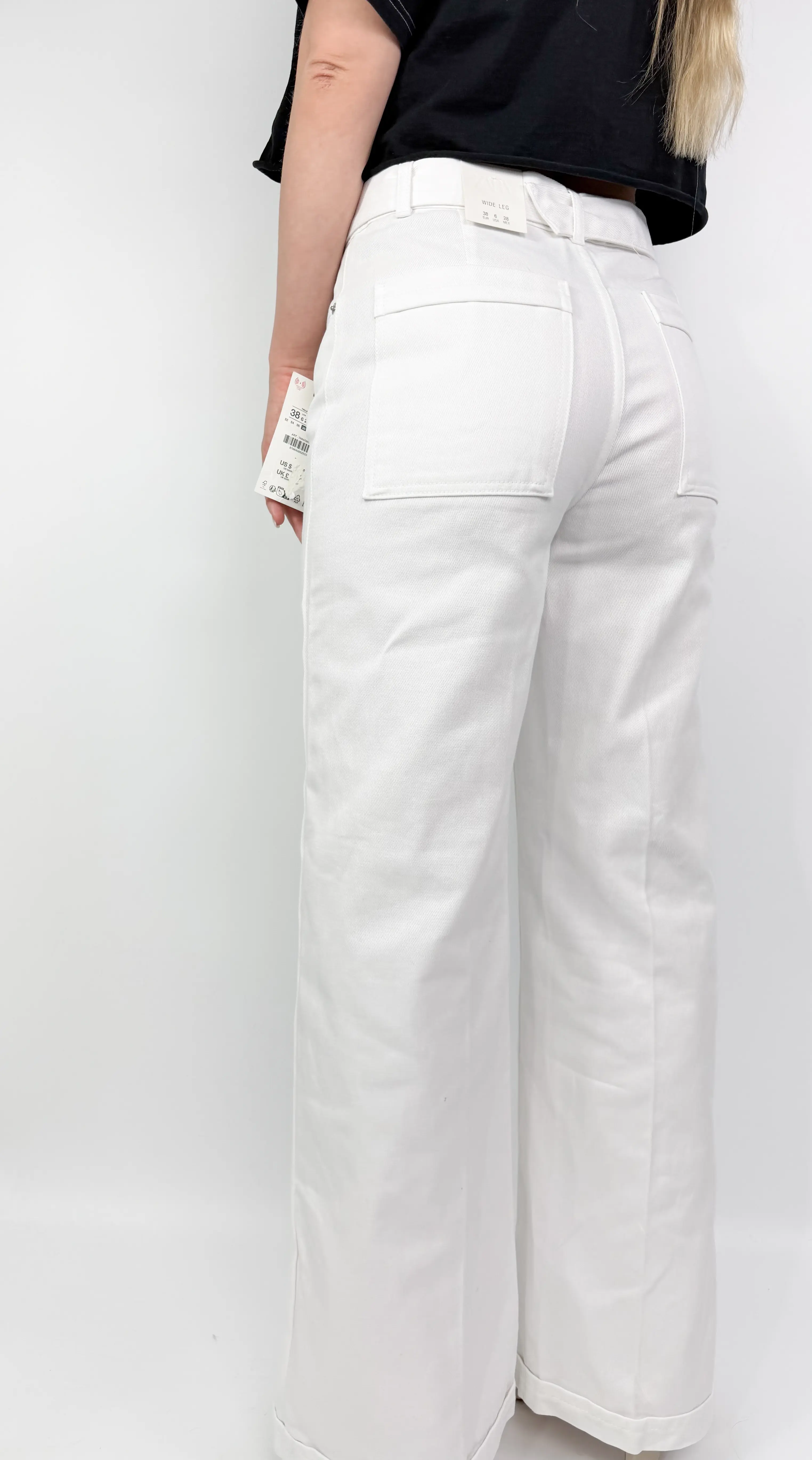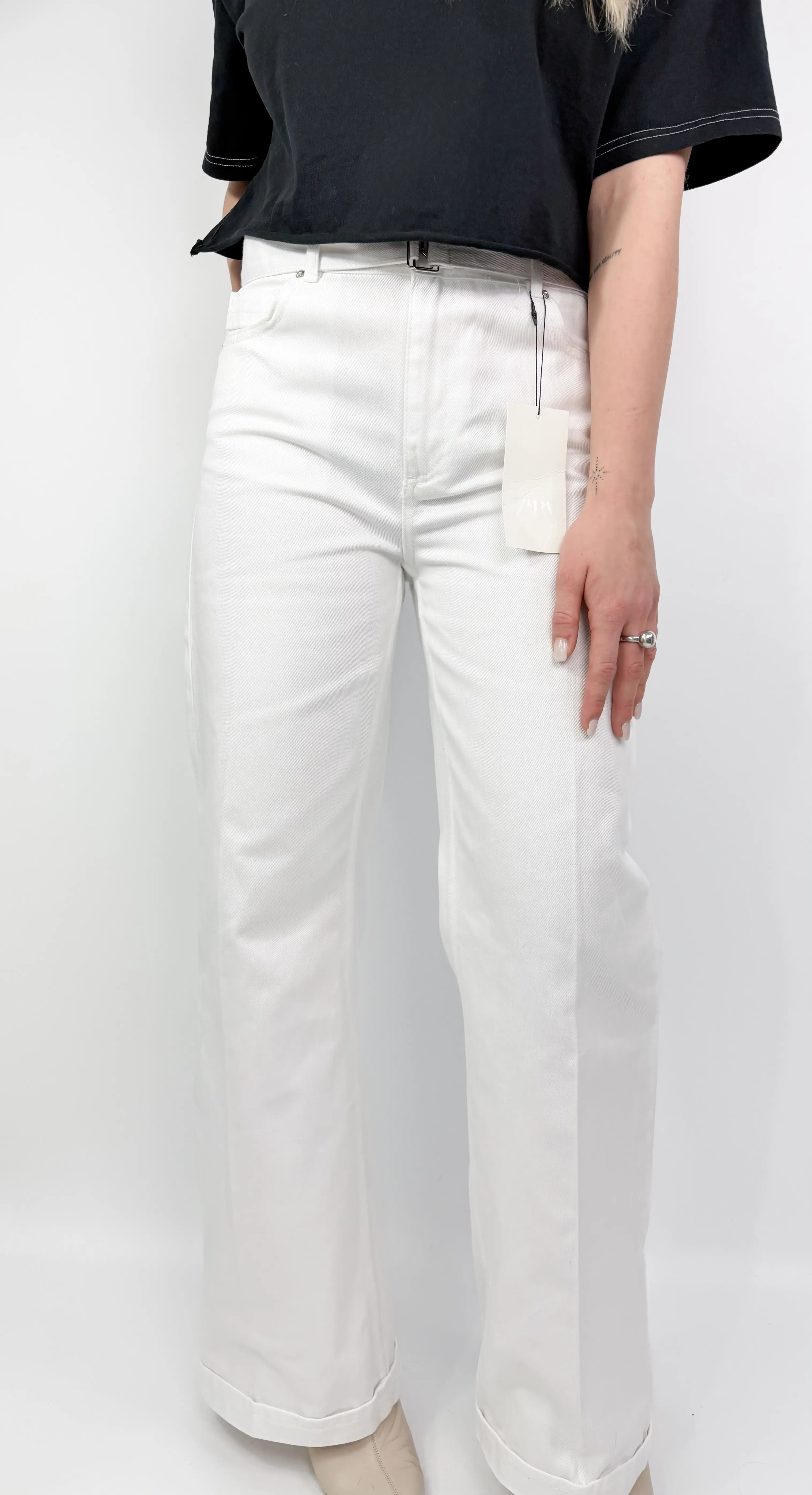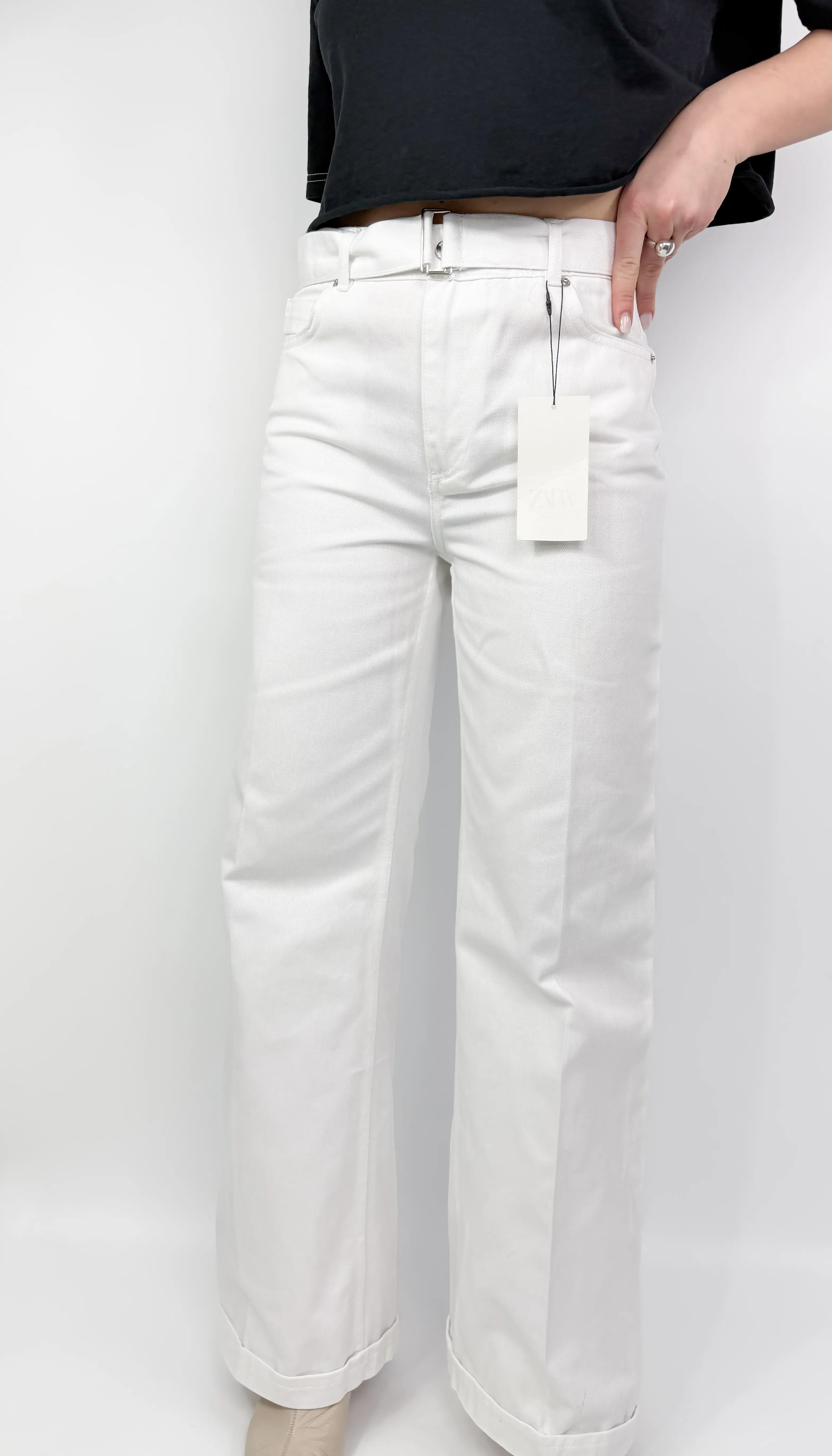 Zara białe spodnie z paskiem